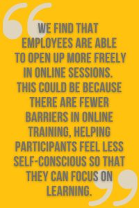 We find that employees are able to open up more freely in online sessions than they are able to in a classroom – at least, in the context of language training. A part of this could be attributed to the idea that there are fewer barriers in online training, helping participants feel less self-conscious so that they can focus on learning. It also helps that online training provides more of a controlled environment than a classroom, allowing participants to feel secure so as to make mistakes and learn from them.